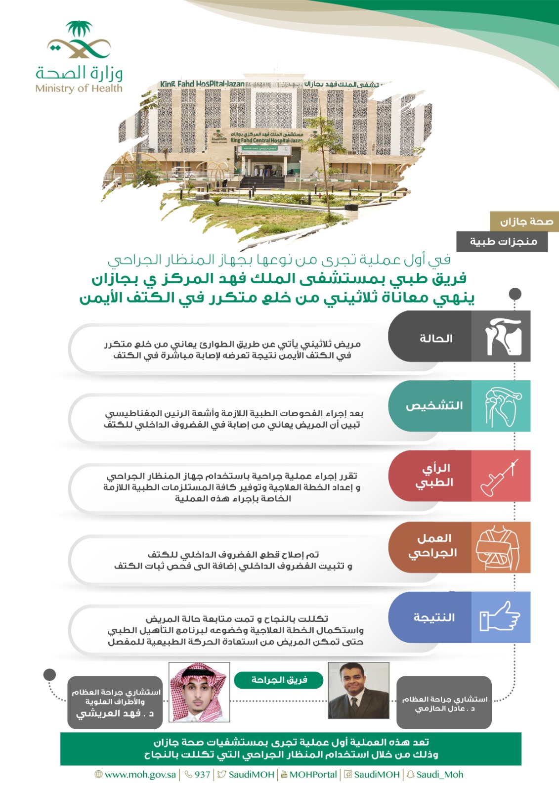 وفي التفاصيل أوضحت صحة جازان بأن قسم الطوارئ بمستشفى الملك فهد المركزي استقبل مريض ثلاثيني يعاني من خلع متكرر في الكتف الأيمن نتيجة تعرضه لإصابة مباشرة في الكتف , وبعد إجراء الفحوصات الطبية اللازمة وأشعة الرنين المغناطيسي من قبل الفريق الطبي المكون من استشاري جراحة العظام الدكتور عادل الحازمي واستشاري جراحة العظام والاطراف العلوية الدكتور فهد العريشي تبين أن المريض يعاني من إصابة في الغضروف الداخلي للكتف , وبعد دراسة حالة المريض من قبل الفريق الطبي تقرر إجراء عملية جراحية بإستخدام جهاز المنظار الجراحي وإعداد الخطة العلاجية وتوفير كافة المستلزمات الطبية اللازمة الخاصة بإجراء هذه العملية.
